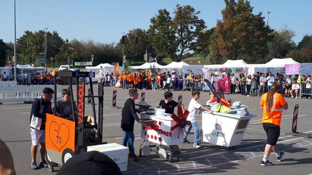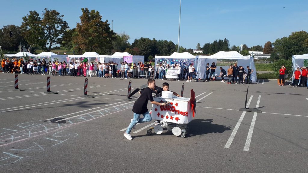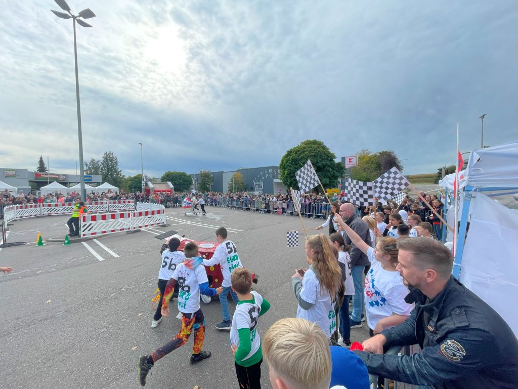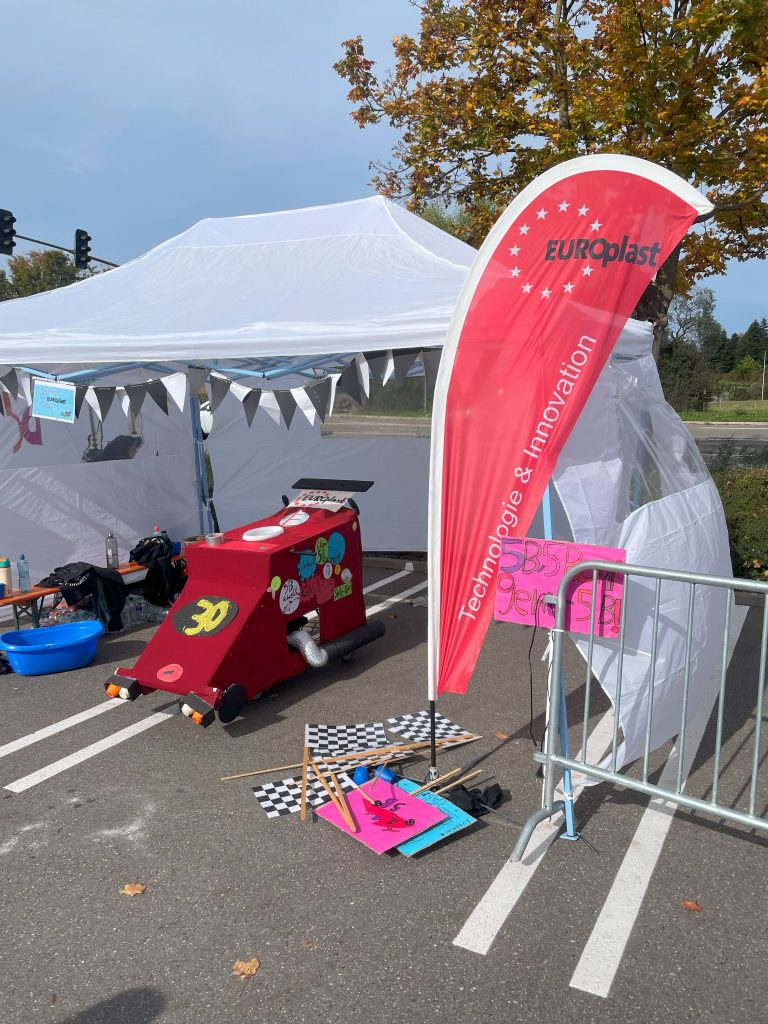 Wie bereits 2023 waren wir auch 2024 wieder als Sponsor für eine Klasse beim Trolley Run der Steinbeis Gemeinschaftsschule in Ilsfeld vertreten. Mit den von uns bereit gestellten Kunststoffteilen wurde ein Einkaufswagen ganz nach Lust und Laune der Schüler designt, gebaut und ins Rennen geschickt. Beim Rennen selbst wird in jedem Trolley ein Eimer mit Wasser transportiert und es geht neben Schnelligkeit darum, möglichst wenig Wasser zu verschütten.